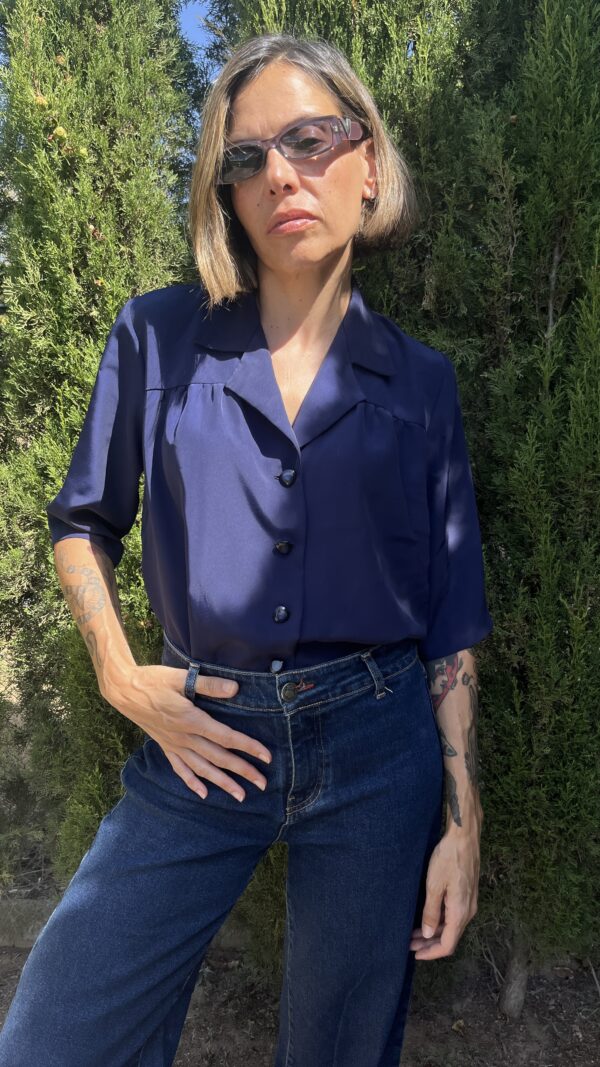 Camisa fluida confeccionada en tejido de tacto sedoso y caída limpia, en un profundo azul marino con brillo elegante. Presenta patrón recto y holgado que favorece el movimiento sin ceñir, canesú delantero con frunces finos que aportan volumen controlado al pecho y hombro suavemente caído. El cuello es de solapa…