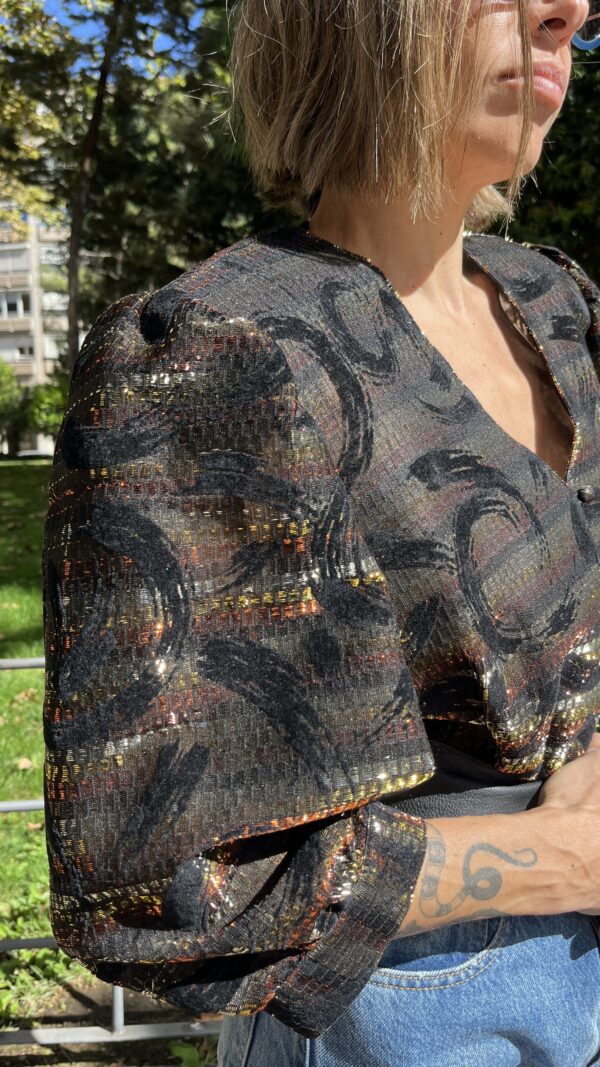 35,00€El precio original era: 35,00€.27,00€El precio actual es: 27,00€.Blusa ligera y espectacular confeccionada en tejido devoré semitransparente de base negra con dibujo abstracto en terciopelo y hilo metalizado en oro y cobre que crea un efecto de malla luminosa sobre toda la superficie. El patrón presenta escote pico limpio, cierre frontal con botones forrados, y hombro con volumen…