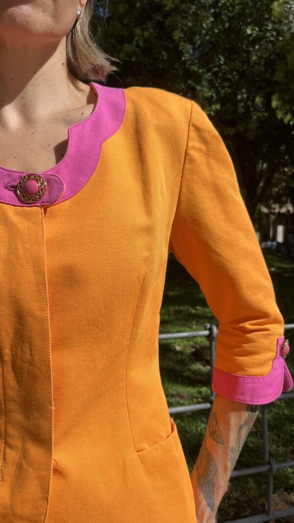 Chaqueta de sastrería ligera en algodón con cuerpo, color naranja intenso, rematada con vistas y vivos en fucsia que enmarcan un escote redondeado con ondulación delicada. El patrón entalla mediante cortes tipo princesa delanteros y traseros, realzando la silueta sin perder comodidad. Presenta manga tres cuartos con vuelta y presilla…