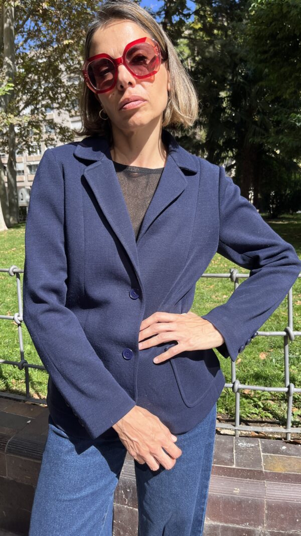 37,00€Americana entallada años 80 en punto estructurado azul marino, con tacto firme y cómoda elasticidad natural. El patronaje dibuja una silueta definida mediante costadillos frontales y traseros, solapa de muesca limpia y cierre cruzado visual de dos botones al tono. Incorpora hombro suavemente armado, bajo redondeado a la cadera y…