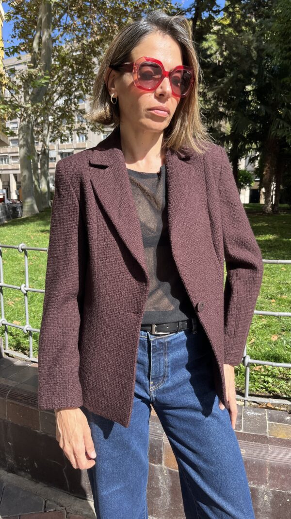 Americana vintage de líneas depuradas y silueta entallada, confeccionada en lana virgen con textura bouclé en un elegante tono ciruela/burdeos. El patrón presenta solapa de muesca estilizada, cierre de un botón forrado al tono que centra la cintura, costadillos delanteros y traseros que esculpen el torso, hombro levemente estructurado y…
