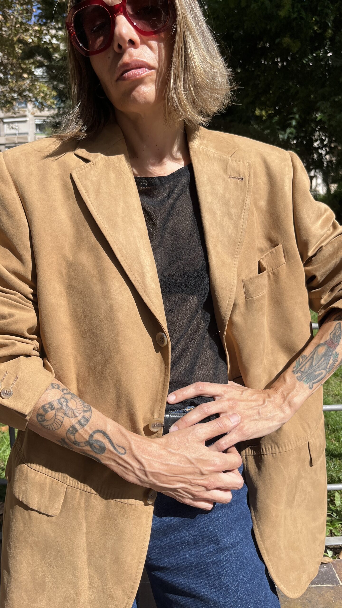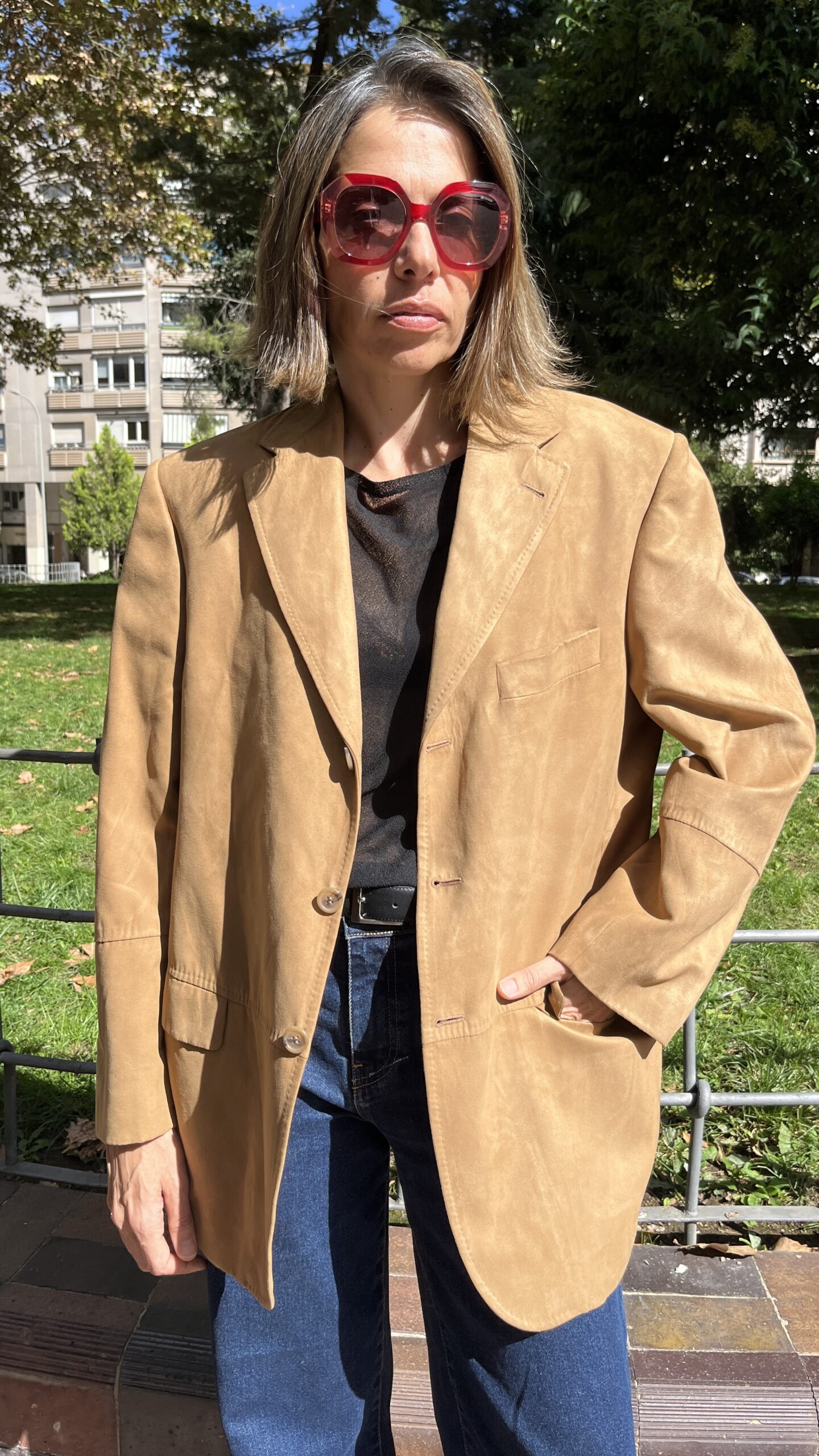 Americana de inspiración sastre con volumen generoso y caída limpia en un ante sintético (100% poliéster) de tacto muy suave. Presenta solapa de muesca amplia, hombro estructurado con hombrera media y cierre frontal de tres botones. El patronaje incorpora pinzas verticales y costadillos que ordenan la silueta sin ceñir, bajo redondeado y largo medio que cubre la cadera. Dispone de bolsillo de pecho tipo ojal y dos bolsillos inferiores con tapeta; las mangas terminan en cuatro botones. Interior completamente forrado en viscosa con jacquard de la marca para un deslizamiento cómodo. Etiqueta Emidio Tucci – El Corte Inglés y etiqueta técnica “ROMA”. Instrucciones originales de cuidado: no lavar, no usar lejía, planchar sin vapor y limpieza en seco. Talla de etiqueta 54 (7R). Datación: años 90, por tejido de ante técnico, largo y amplitud característicos de la década y etiquetas corporativas de El Corte Inglés.