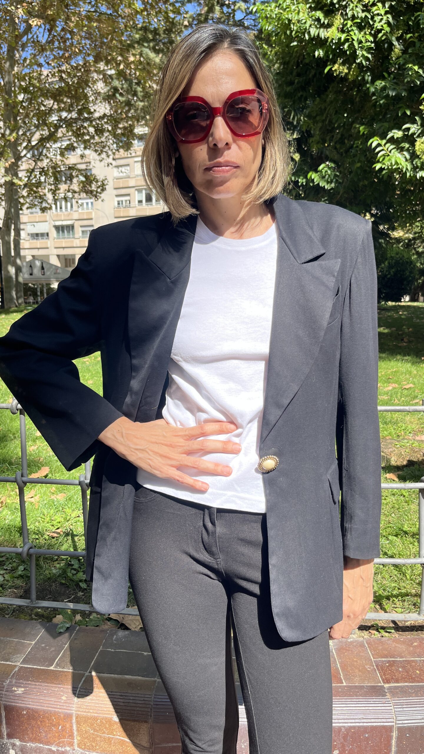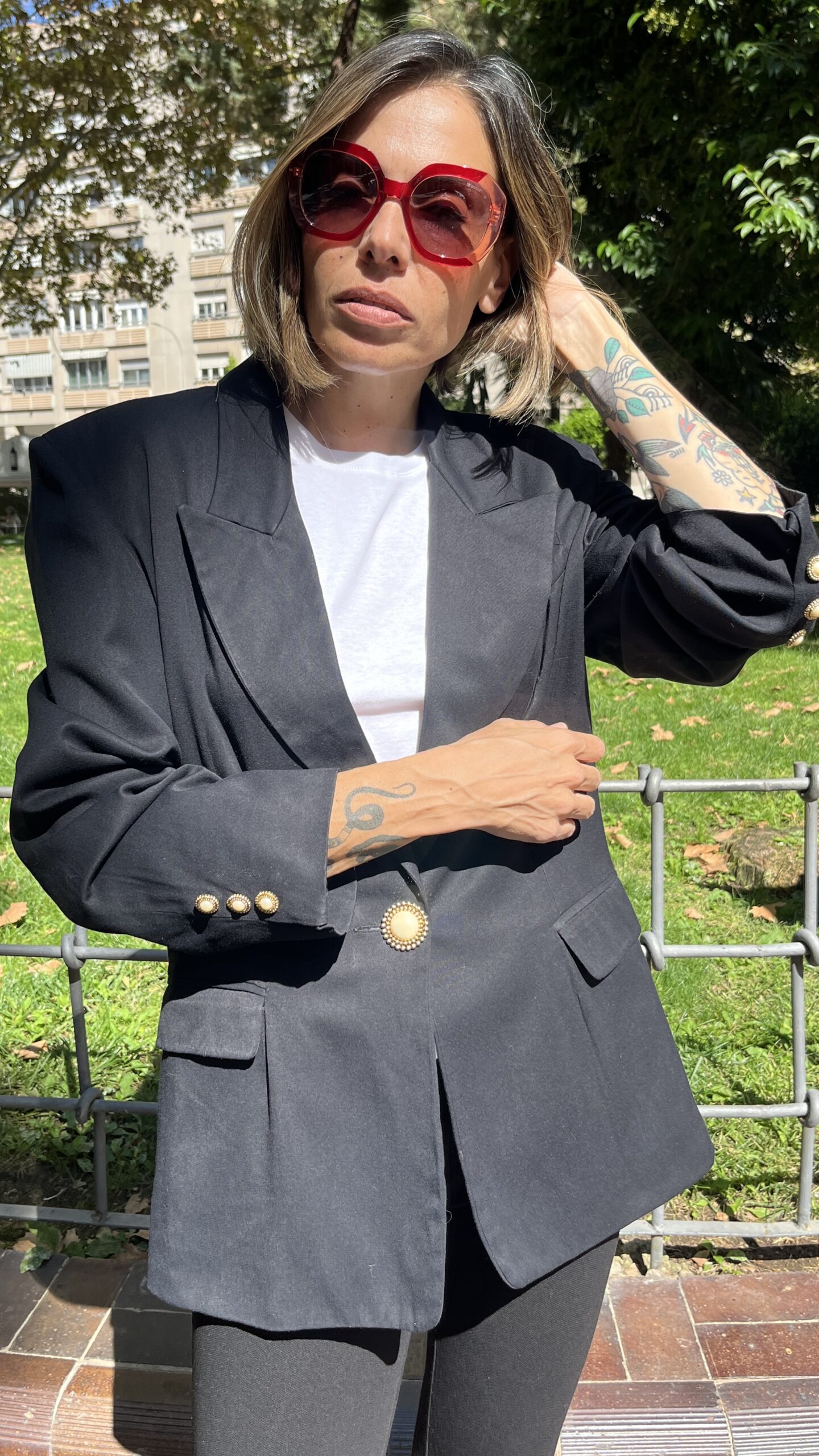 Americana negra con cierre de un botón joya dorado y silueta estructurada propia de finales de los 80. Patronaje single-breasted, solapa de muesca marcada, hombro con hombrera media que define la línea y abertura central en la espalda para dar movimiento. Delantero con dos bolsillos de vivo con tapeta perfectamente nivelados y bocamangas rematadas con tres botones dorados a juego. El largo cubre cadera y estiliza sin perder comodidad.