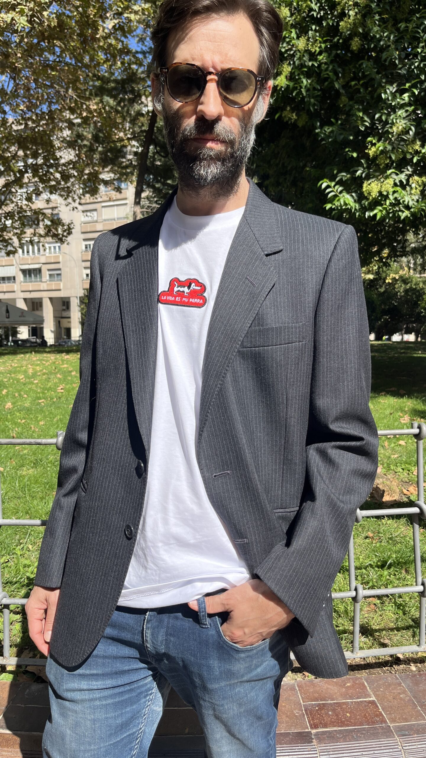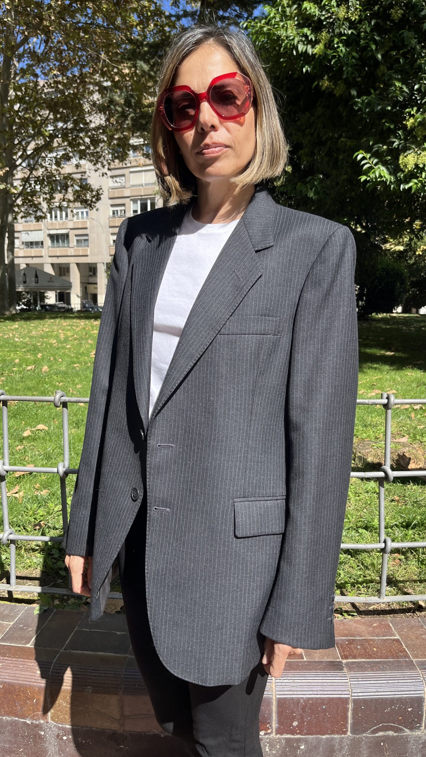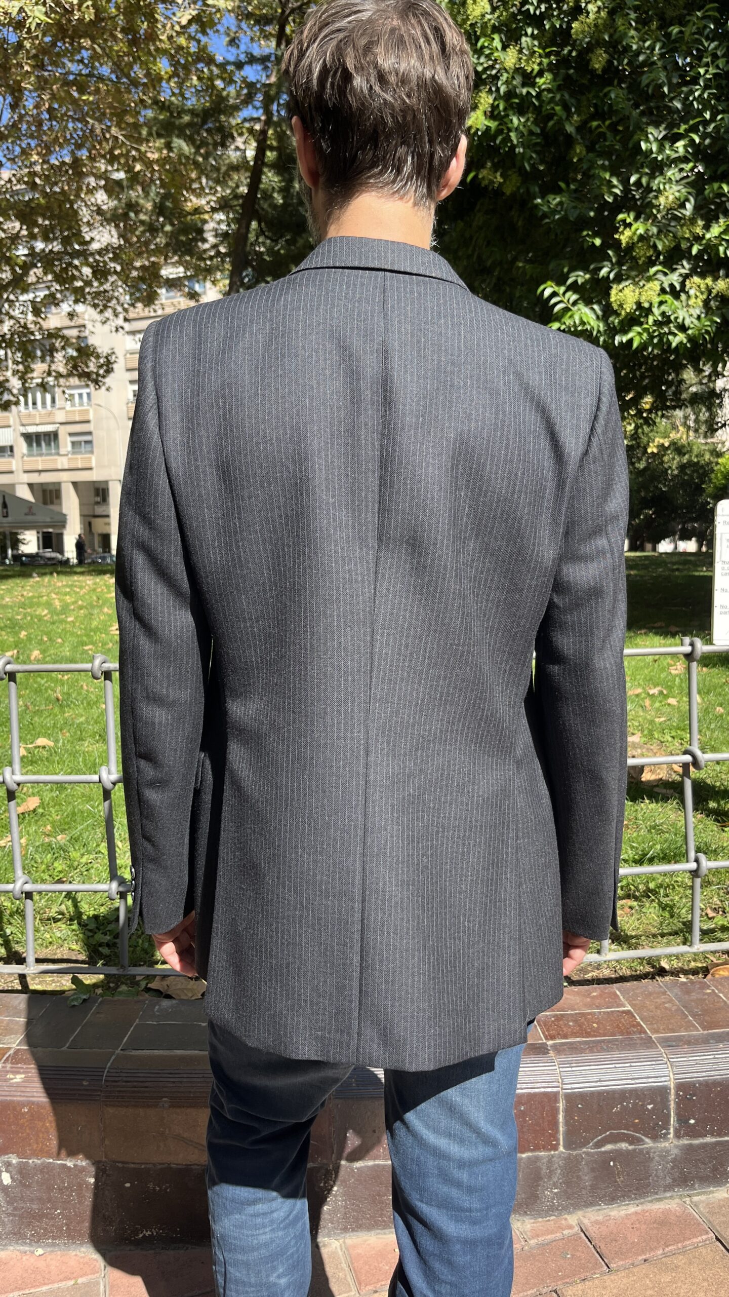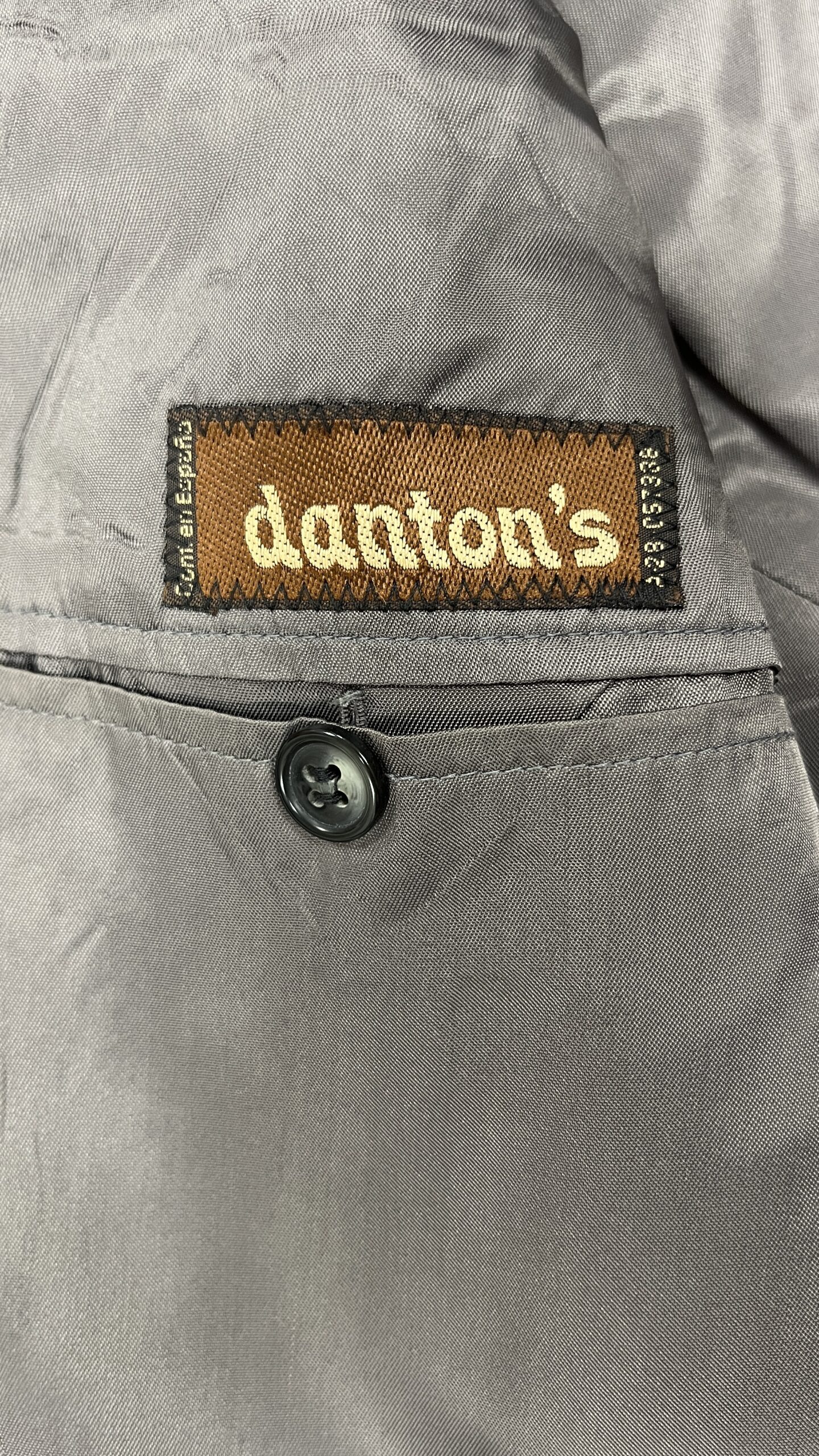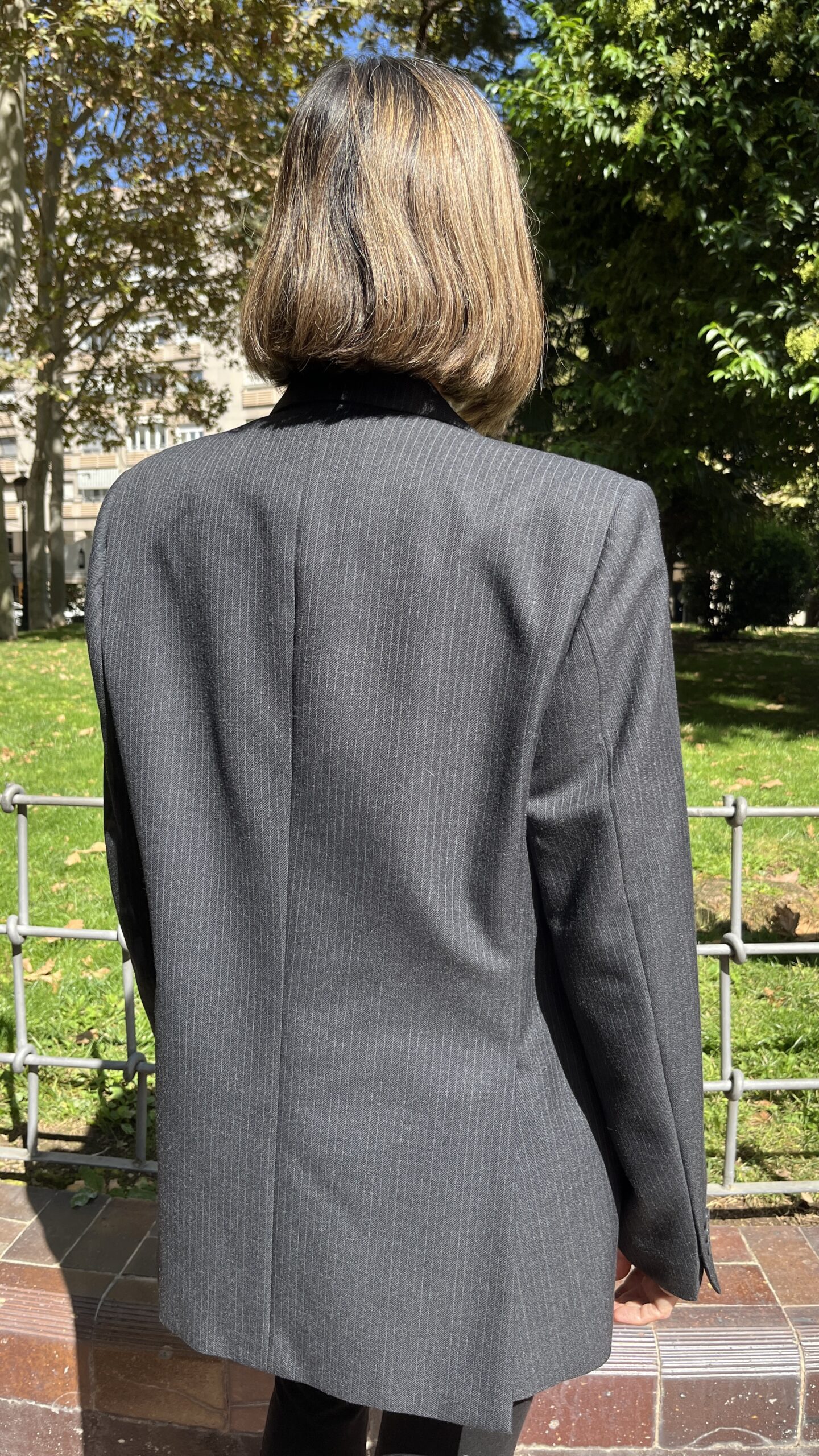 Blazer de sastrería de la firma «Danton´s» en tejido mezcla con raya diplomática fina sobre base gris antracita. Presenta un patronaje recto y ligeramente amplio, con hombro estructurado y hombreras discretas que definen la línea. Solapa de muesca de ancho medio, cierre cruzado de aspecto clásico a dos botones (posición centrada), y manga larga con puño de tres botones. En el frontal incorpora bolsillo de ojal en pecho, dos bolsillos de vivo con solapa a la cadera y tercer bolsillo de vivo fino en el lado izquierdo, detalle propio de confección cuidada. Espalda con costuras de entalle y bajo recto, lo que aporta caída limpia y vertical. Totalmente forrada en satén gris para favorecer el deslizamiento al vestir.