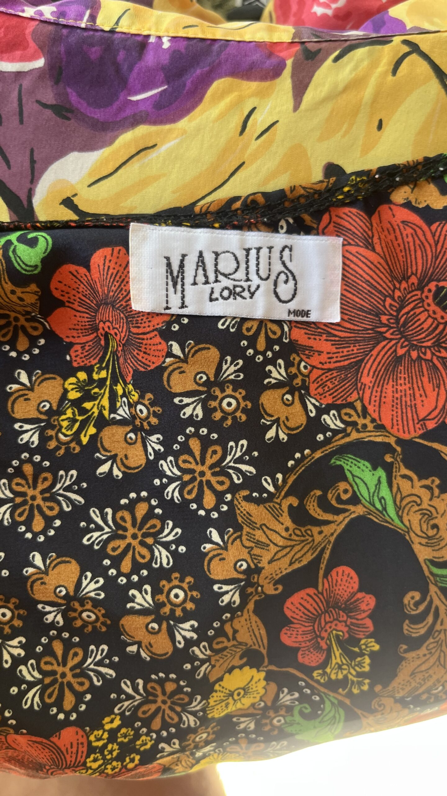 El tejido luce un estampado folk/floral de inspiración bohemia sobre fondo negro: flores rojas y mostaza con toques verdes conviven con motivos menudos en blanco y volutas ocres, logrando profundidad y riqueza cromática.