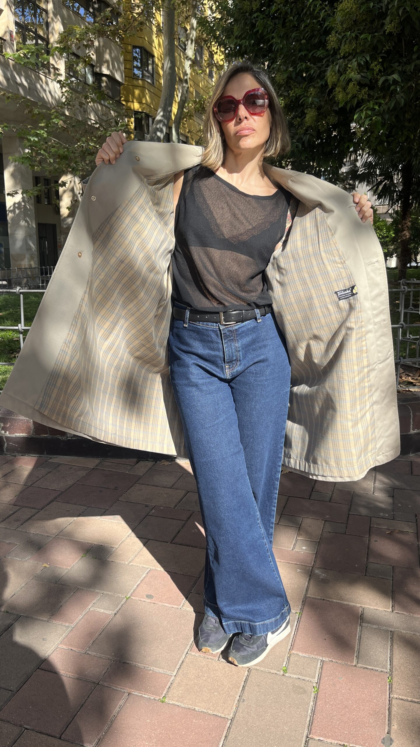 Gabardina Cortefiel en twill beige Terlenka® con forro de cuadros . Principios de los 80