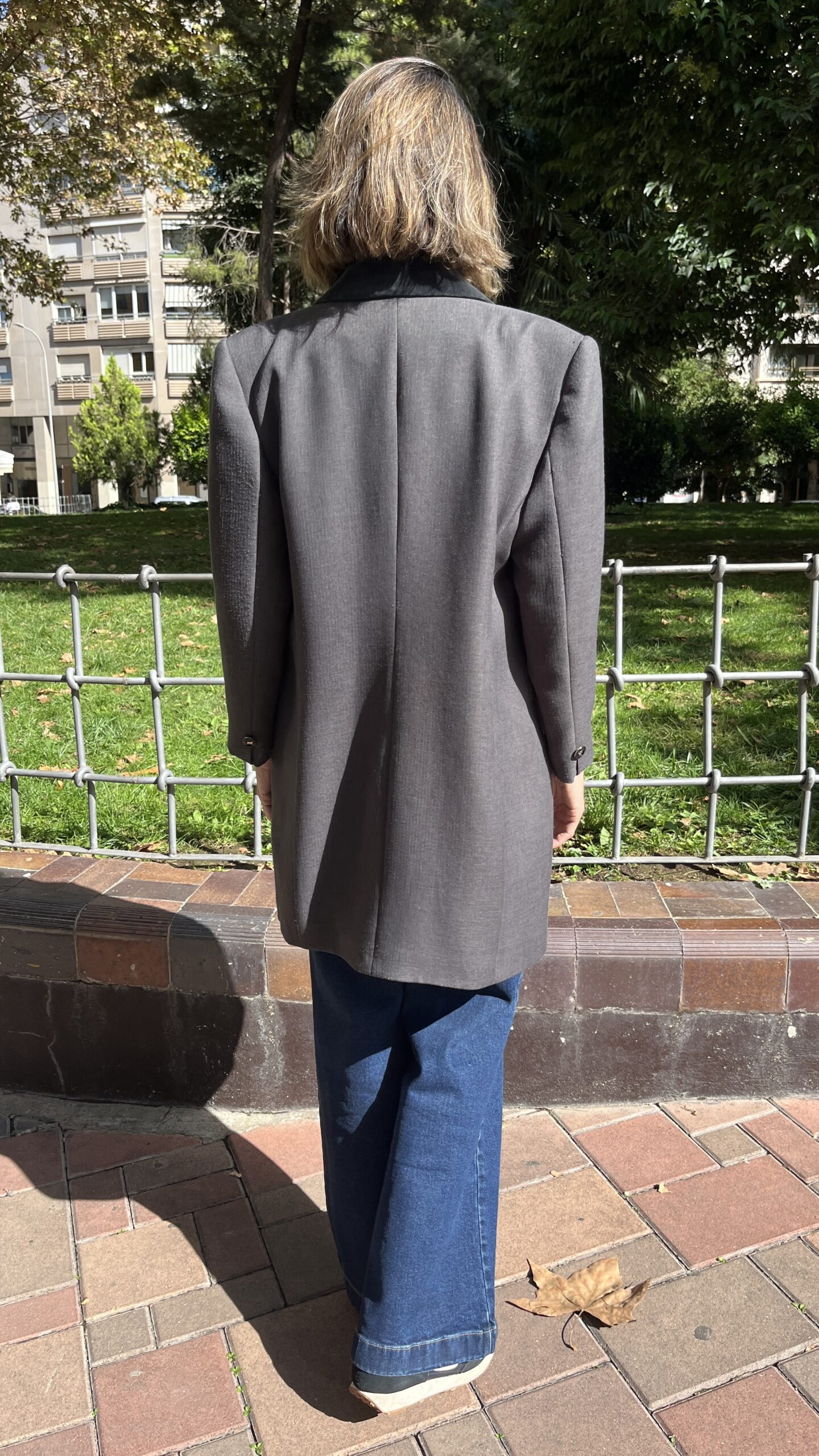 Levita vintage de línea alargada y hombro estructurado, confeccionada en tejido sastrero gris con cuello de terciopelo negro que aporta contraste sofisticado. El patrón se entalla mediante pinzas verticales desde el pecho hasta la cadera y remata en un largo a mitad de muslo de gran efecto estilizador. Cierra en el centro con cinco botones tipo joya (negro facetado con aro dorado) y presenta bolsillos con tapeta inclinados, bocamanga con botón y espalda con costura central y bajo limpio. Interior totalmente forrado en tafetán gris para una caída impecable.